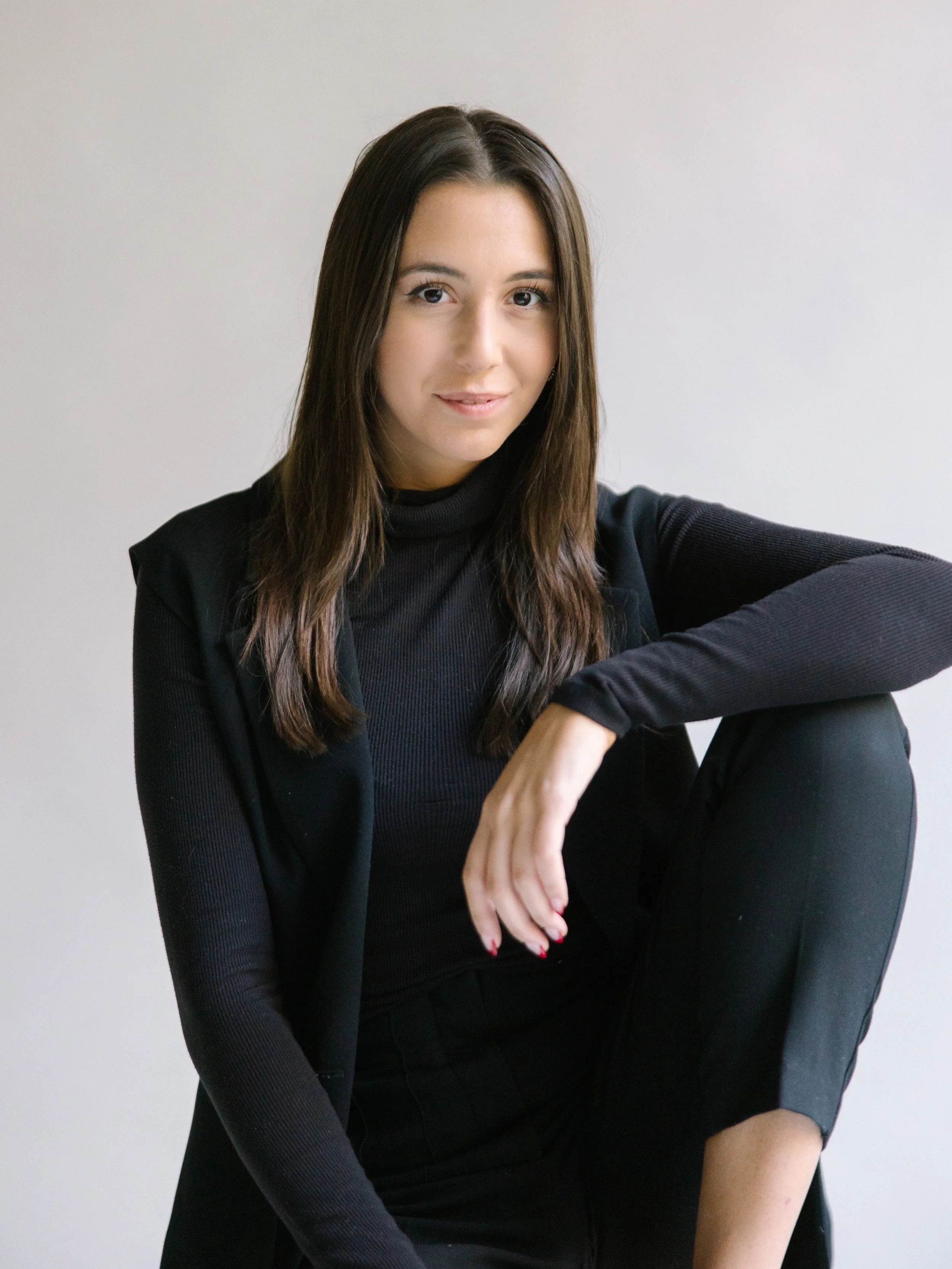 Woman with long brown hair wearing a black outfit, seated in a casual pose against a plain background.